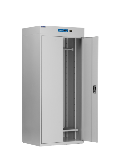 Nowoczesne urządzenie, zaprojektowane do założonej funkcji, konstrukcja stalowa, wykonana z blachy ocynkowanej, malowana elektrostatycznie – kolor RAL 7035, struktura. Stopki poziomujące, chowany przewód zasilający o długości L = 2,3 mb. Zamek patentowy. Szafa wyposażona w intuicyjny elektroniczny sterownik z regulacją czasu i temperatury suszenia, funkcją wentylowania oraz wskaźnik wilgotności odprowadzanego powietrza. Szafa posiada zabezpieczenia przeciwpożarowe oraz przeciw niekontrolowanemu wzrostowi temperatury. Wewnętrzna przestrzeń szafy posiada drążek oraz jedną ażurową półkę, którą można przestawiać na różne wysokości. Wnętrze szafy umożliwia rozmieszczenie wielu półek (max. 15 szt.), na których można zawiesić haki w celu suszenia małych przedmiotów np. roboczych rękawic, butów itp. Dodatkowe półki, haki i wieszaki do nabycia.