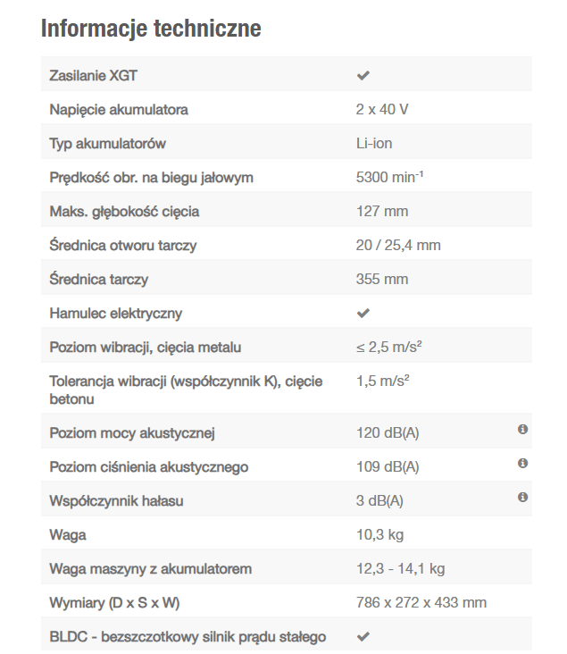 Akumulatorowa przecinarka CE001G ( sama przecinarka bez akumulatorów i ładowarki) to profesjonalne narzędzie dla osób wymagających mocy, bez korzystania z maszyn spalinowych. Wyposażona została w technologię AFT – Active Feedback Sensing – polegającą na automatycznym wyłączeniu narzędzia w celu ochrony użytkownika w przypadku nagłego spowolnienia lub zatrzymania tarczy (tzw. kick-back). Narzędzie jest również wodoodporne dzięki technologii WetGuard. Maksymalna głębokość cięcia wynosi 127 mm.