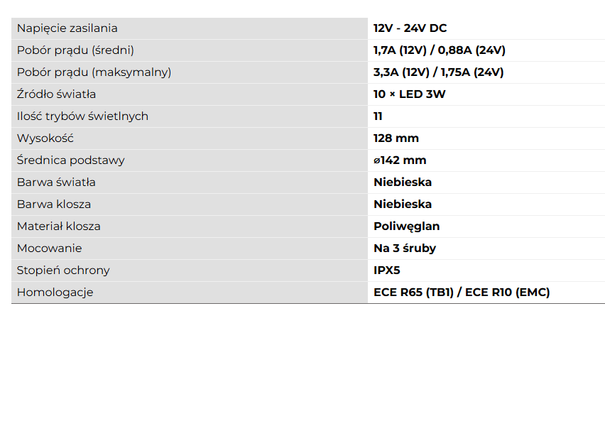 Pojedyncza lampa ostrzegawcza wykonana w technologii LED. Źródłem światła jest 10 wysokowydajnych diod zapewniających niski pobór prądu. Wykonany z poliwęglanu klosz odporny na uszkodzenia mechaniczne, dzięki ryflowaniu pełni rolę dodatkowej soczewki rozpraszającej światło i zapewnia doskonałą widoczność. Zastosowanie aluminiowego słupka, na którym umieszczono diody zwiększa wytrzymałość lampy oraz wspomaga odprowadzanie ciepła.