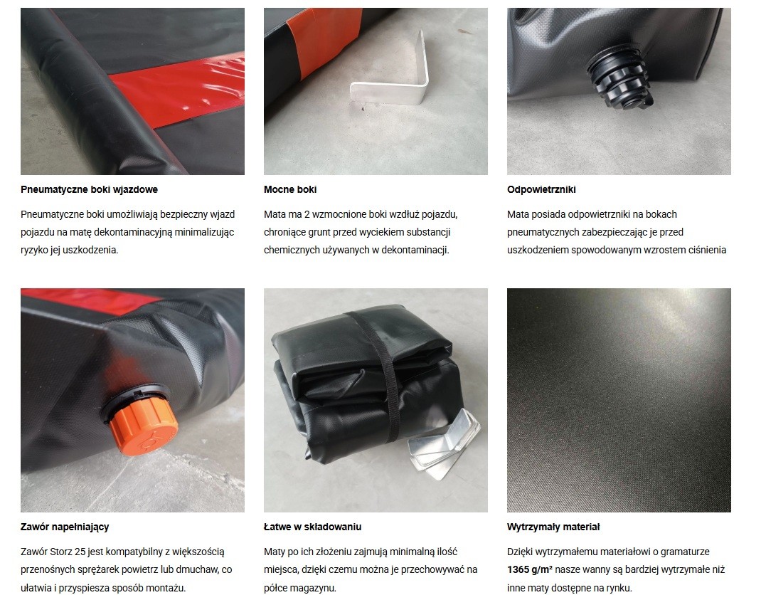 • Pneumatyczne boki wjazdowe – napełniane powietrzem, elastyczne elementy kierujące koła pojazdu do wnętrza maty i zapobiegające rozpryskom cieczy.